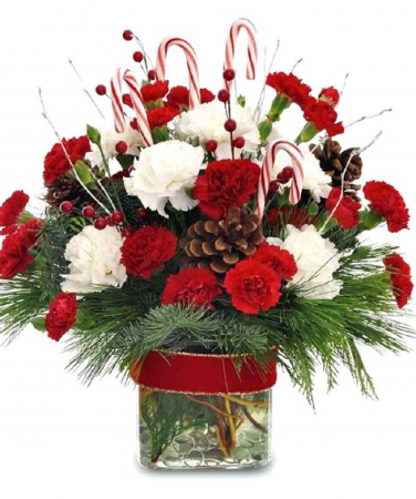 Christmas wishes brings the holiday spirit to all. A variety of seasonal flowers accented with berries,candy canes (not edible), and ribbon all arranged in a clear cube. A great match for any decor. The picture is our deluxe, also available in premium.