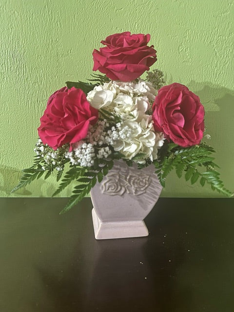 Arranged in a rose embossed container, This selection makes a welcome gift for any occasion. It is available as shown with pink roses, white hydrangeas and accents of babies breath as deluxe or with white roses as premium.